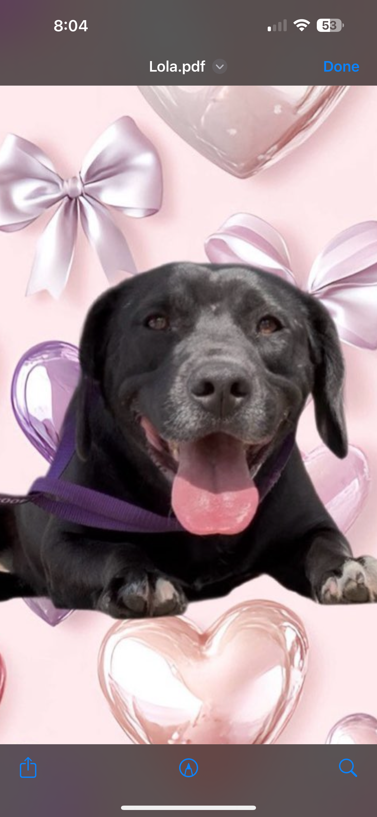 She absolutely loves treats and thrives on affection. Lola is very people-oriented and enjoys being around her family, including children.