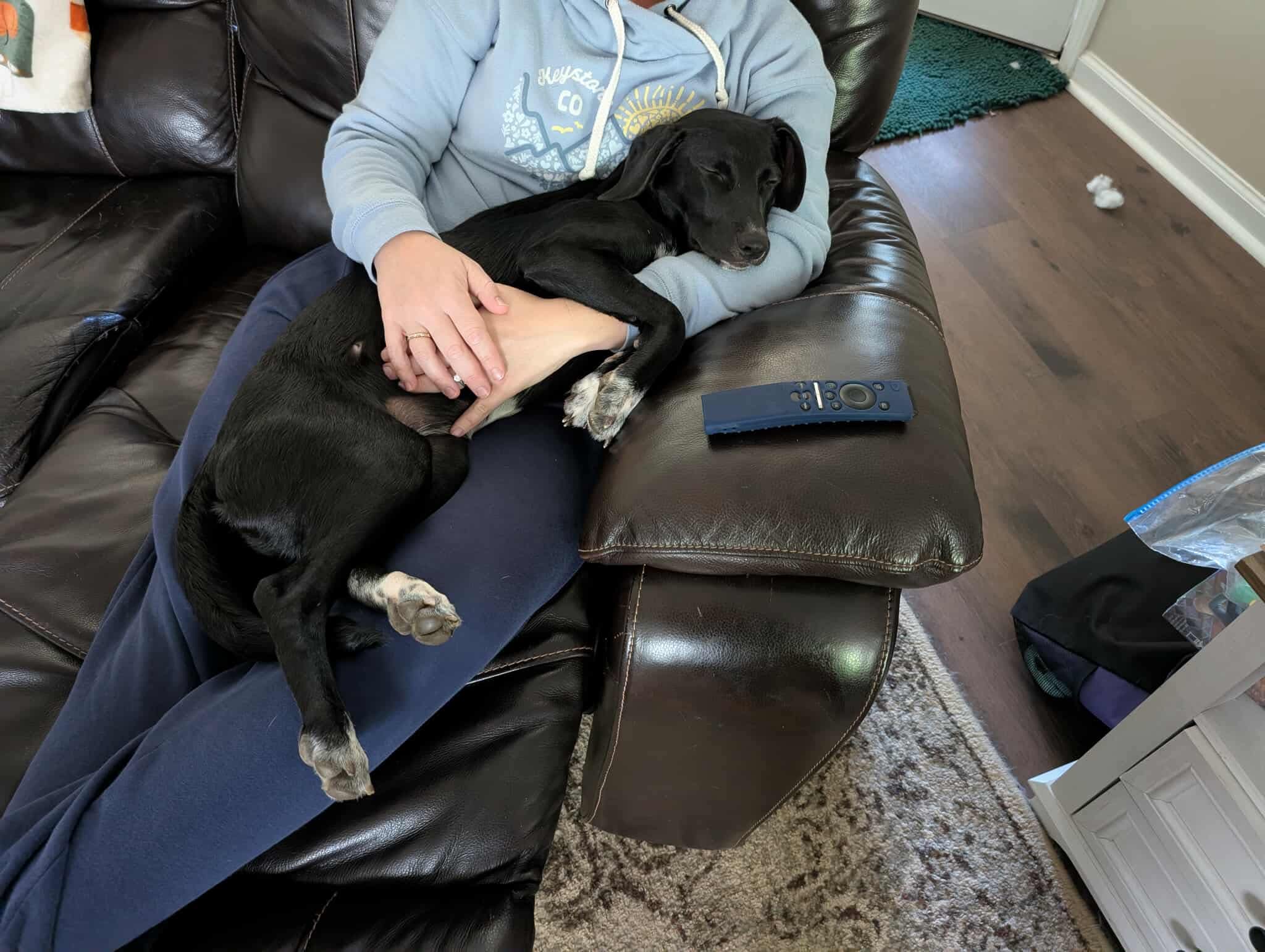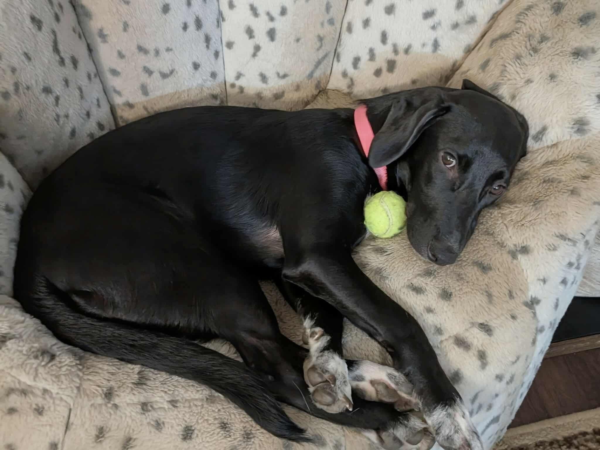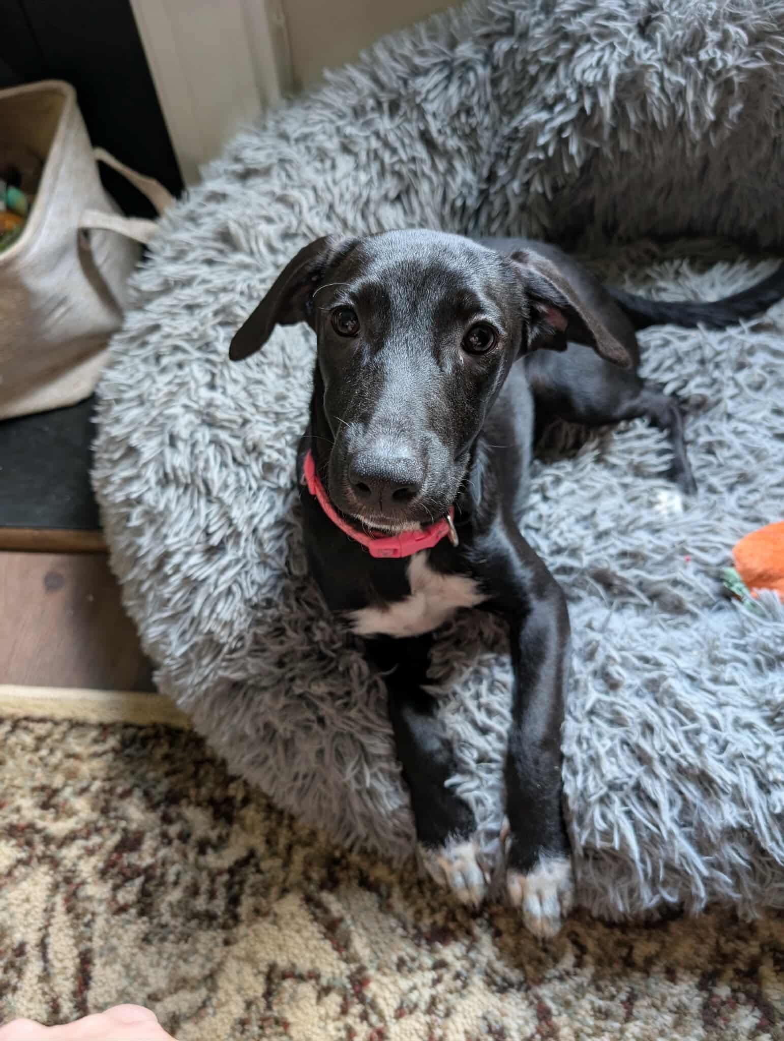 Meet the queen of SHNUGGLES!!! Beverly is a beautiful sleek coated girl and looks lab hound mix. She is a quick learner and doing great on her basic commands and leash skills. Bev is a petite gal and best guess is shell be around 4o lbs full grown. She is very affectionate, loves to play, but is also happy to sprawl out on the couch and nap as you can see in her photos! She is spayed, chipped, vaccinated, on prevention and dewormed. She is super social and outgoing. Bev adores people and other dogs and is in foster with cats. She is also potty and crate trained. Beverly is spayed, chipped and current on vaccines. Her adoption fee is $375