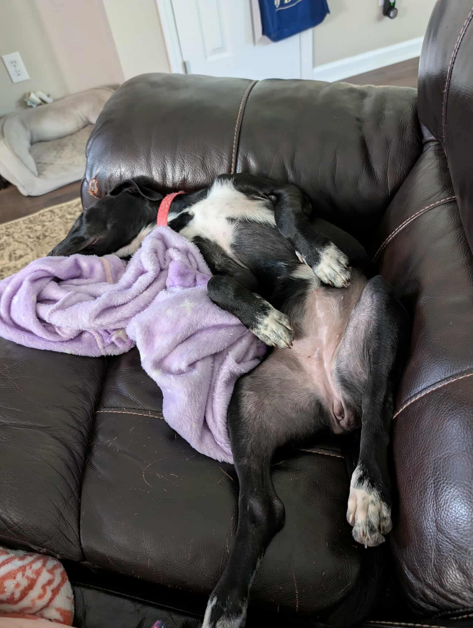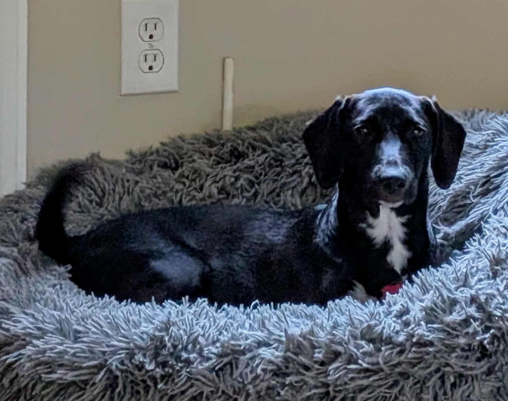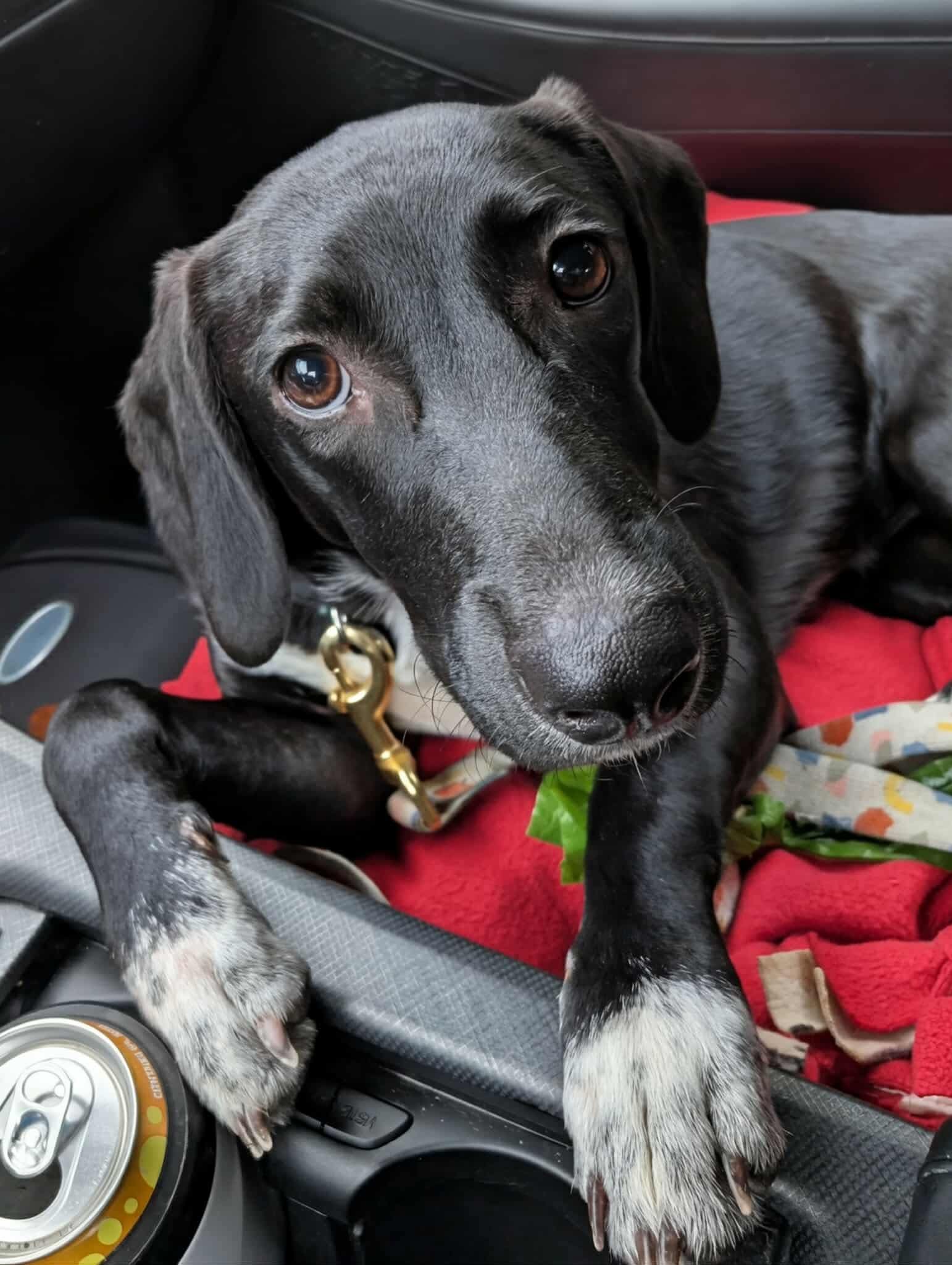 Meet the queen of SHNUGGLES!!! Beverly is a beautiful sleek coated girl and looks lab hound mix. She is a quick learner and doing great on her basic commands and leash skills. Bev is a petite gal and best guess is shell be around 4o lbs full grown. She is very affectionate, loves to play, but is also happy to sprawl out on the couch and nap as you can see in her photos! She is spayed, chipped, vaccinated, on prevention and dewormed. She is super social and outgoing. Bev adores people and other dogs and is in foster with cats. She is also potty and crate trained. Beverly is spayed, chipped and current on vaccines. Her adoption fee is $375