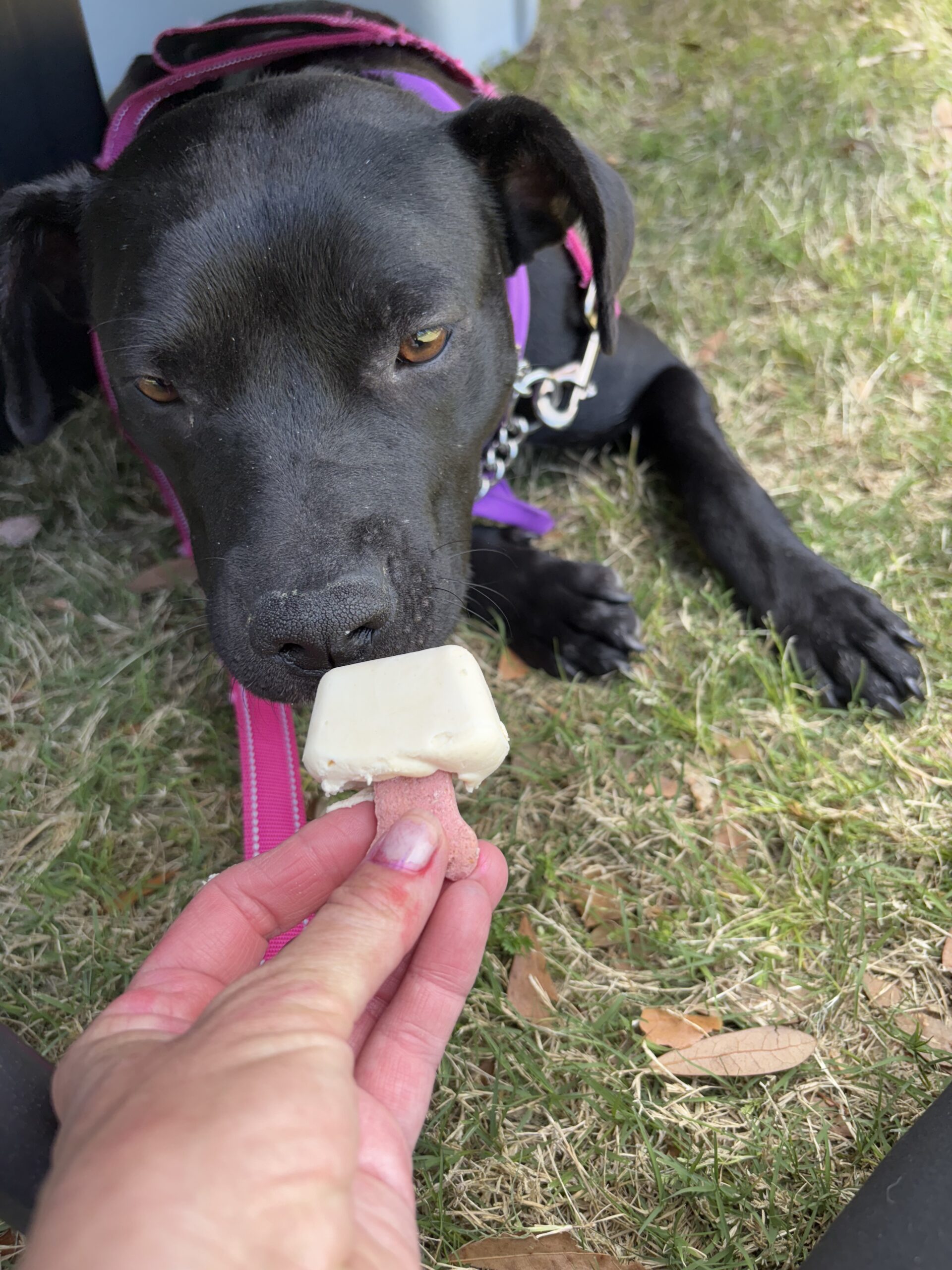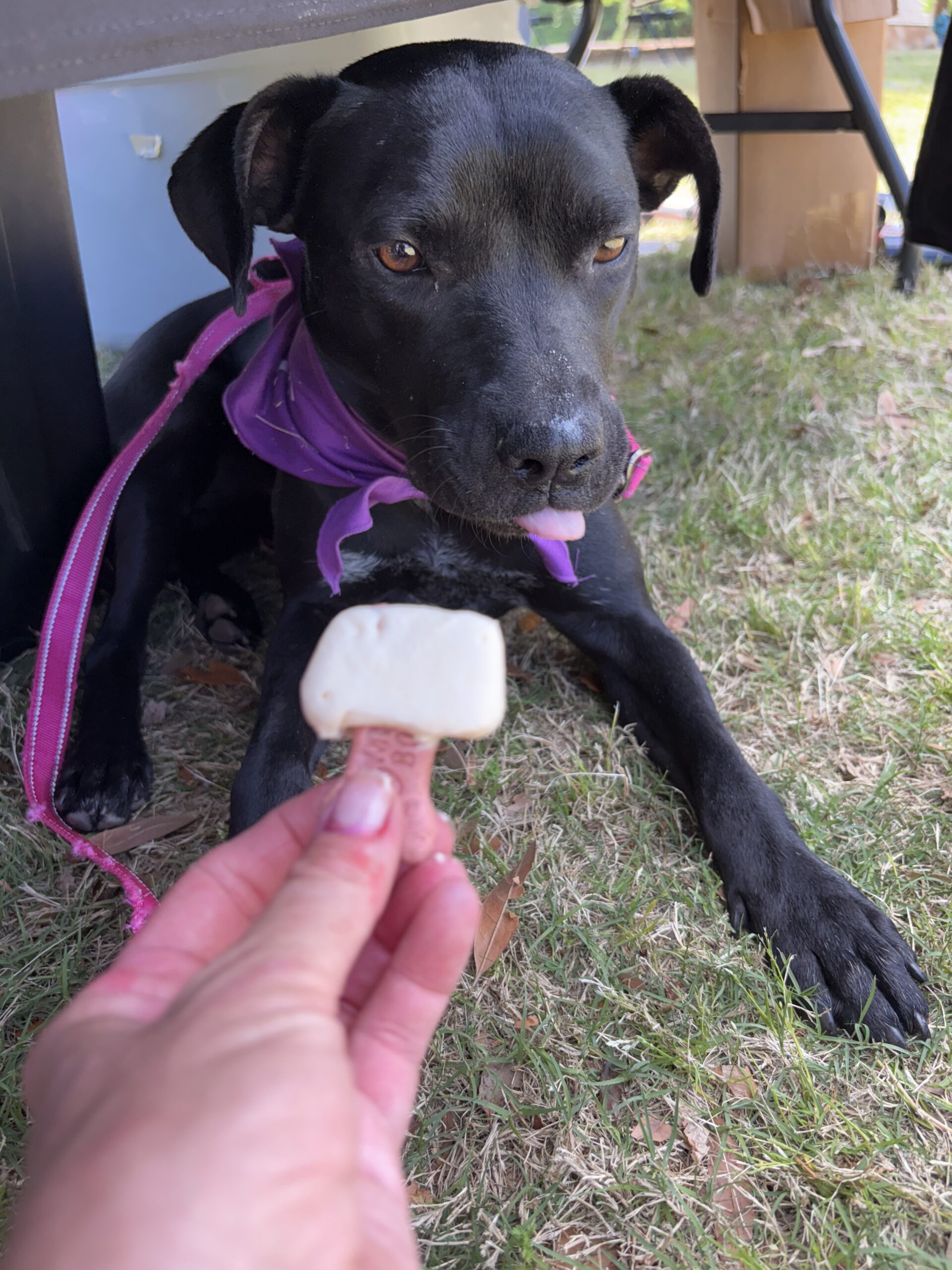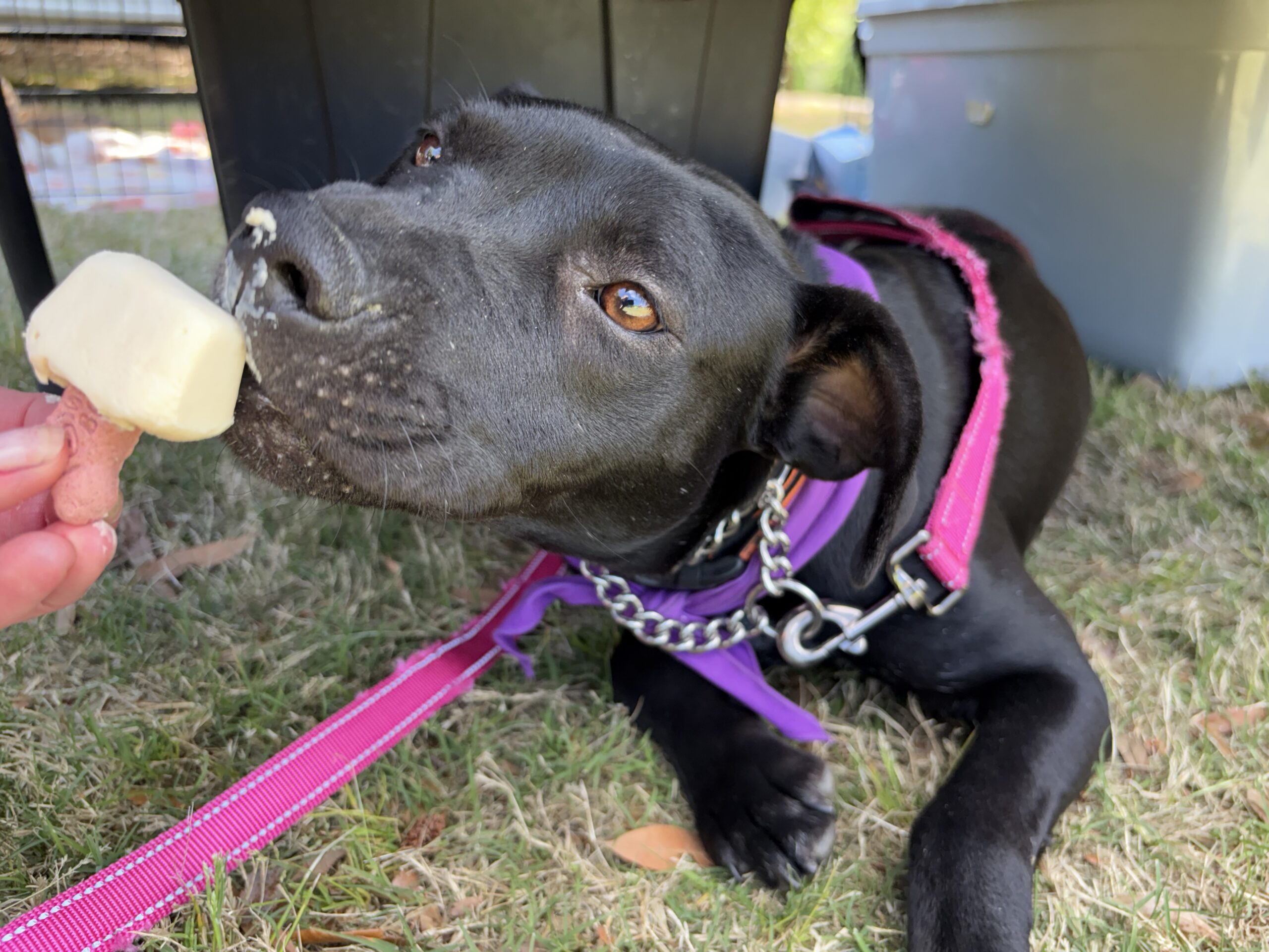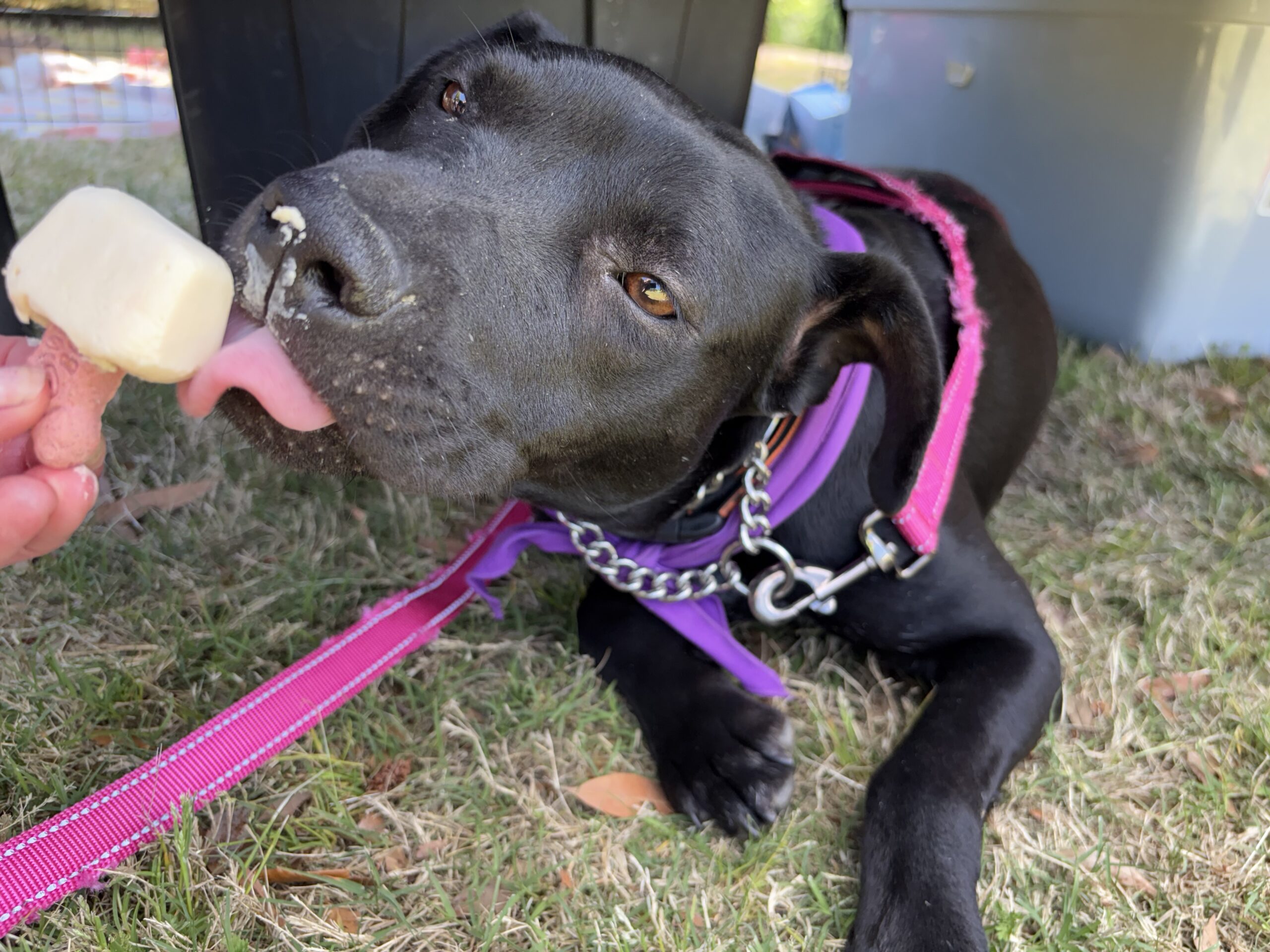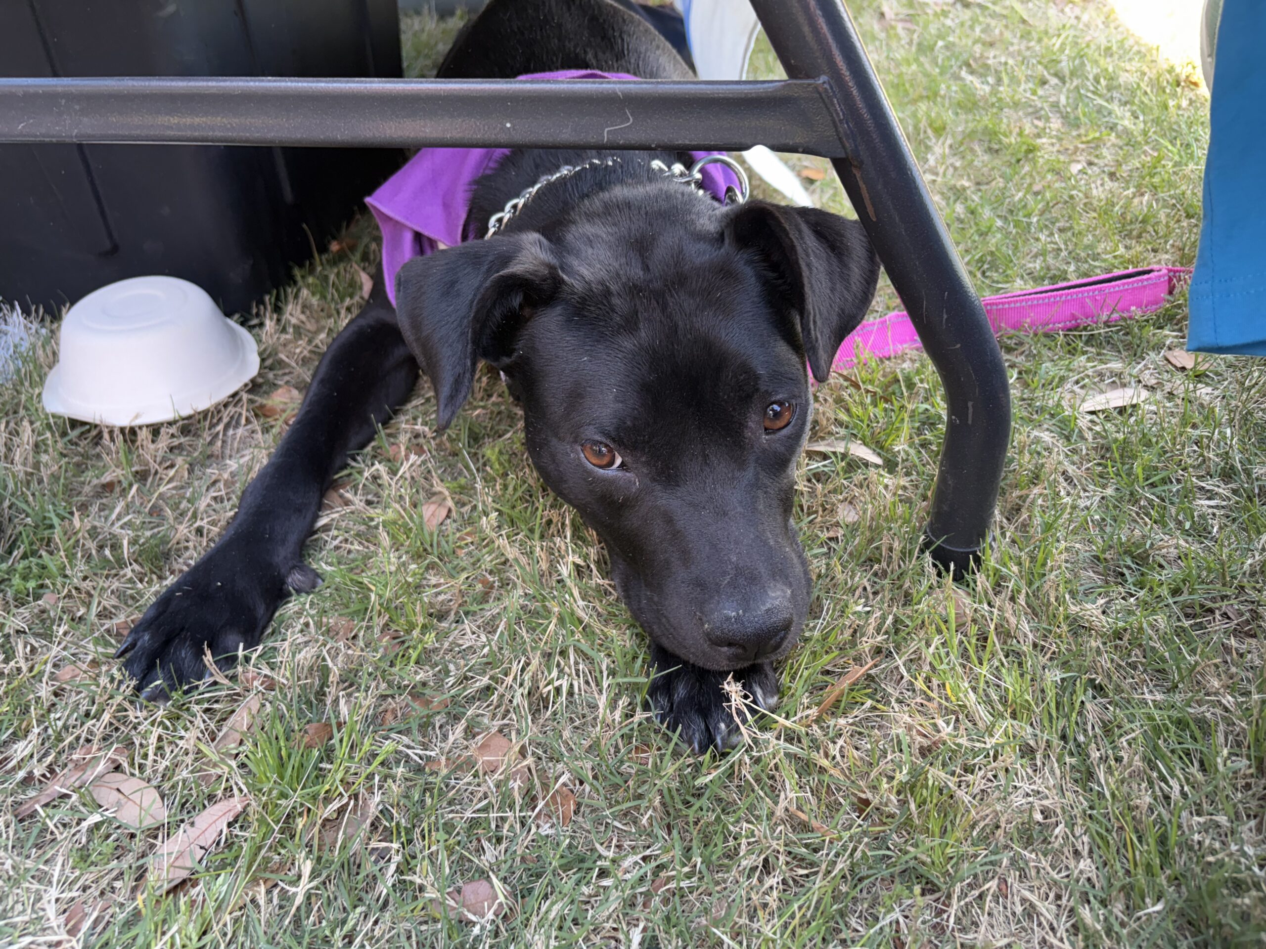 Cinder is a beautiful, full-grown girl weighing in at a perfect 40 pounds — the just-right size for couch cuddles, sunny yard adventures, and everything in between. She absolutely loves long naps stretched out in the warm sunshine, soaking up rays like it’s her full-time job. When she’s not perfecting her sunbathing routine, Cinder enjoys playing with other dogs and would be happy to have a canine buddy to romp around with. She has a laid-back, lounge-around kind of vibe and is happiest when she can relax near her people after a little playtime. If you’re looking for a perfectly sized companion who balances fun and chill effortlessly, Cinder is your girl. 💛