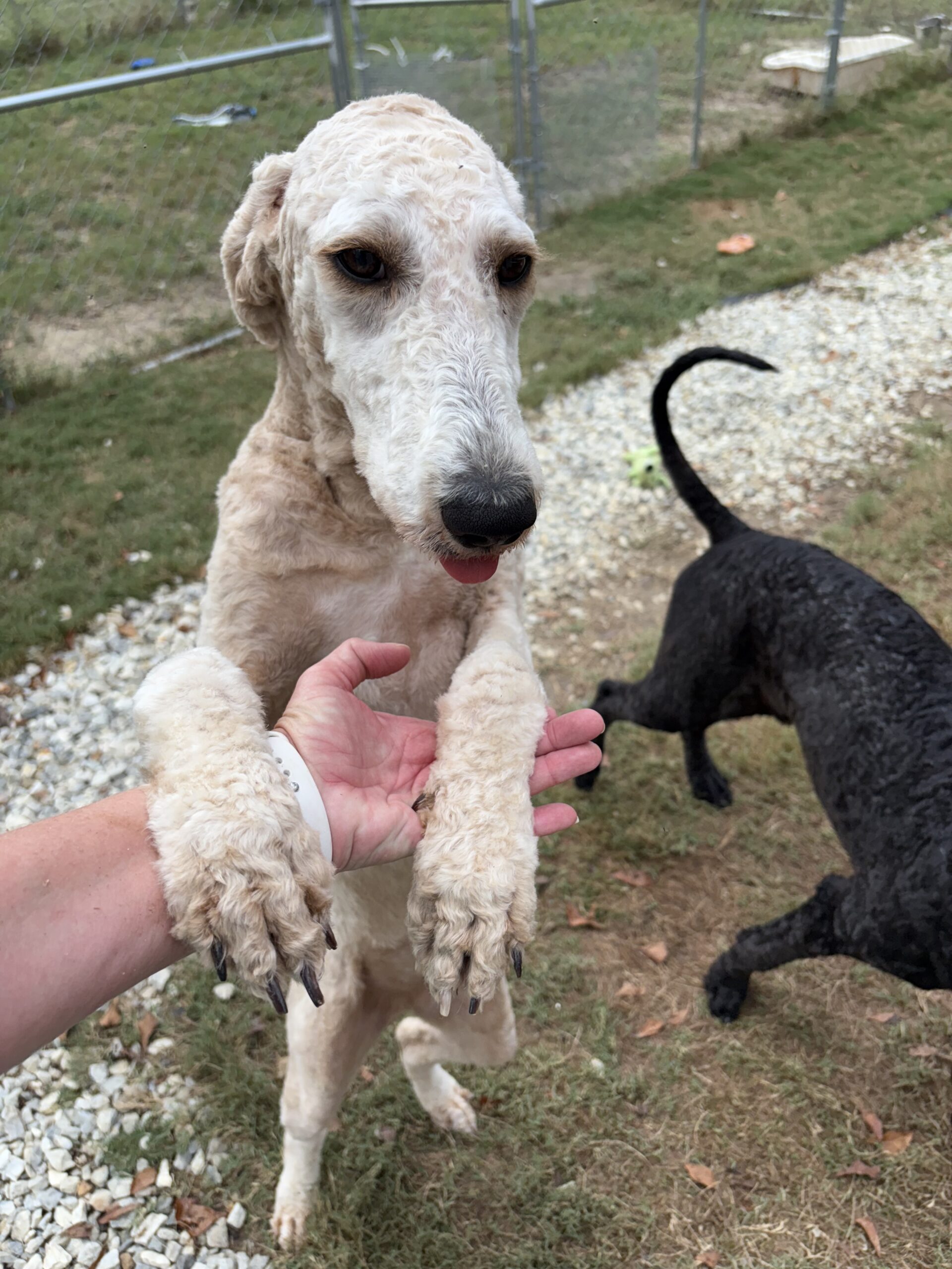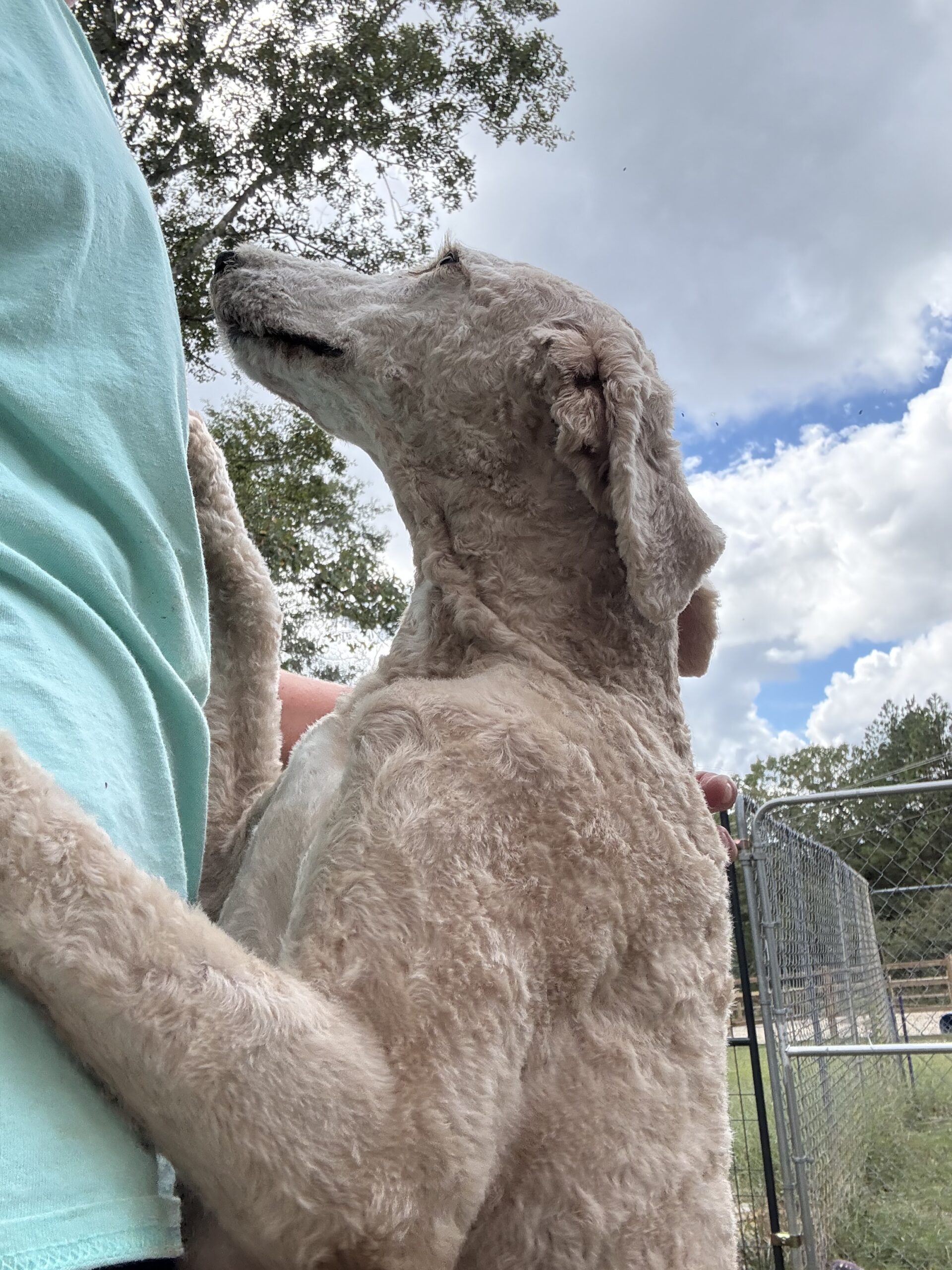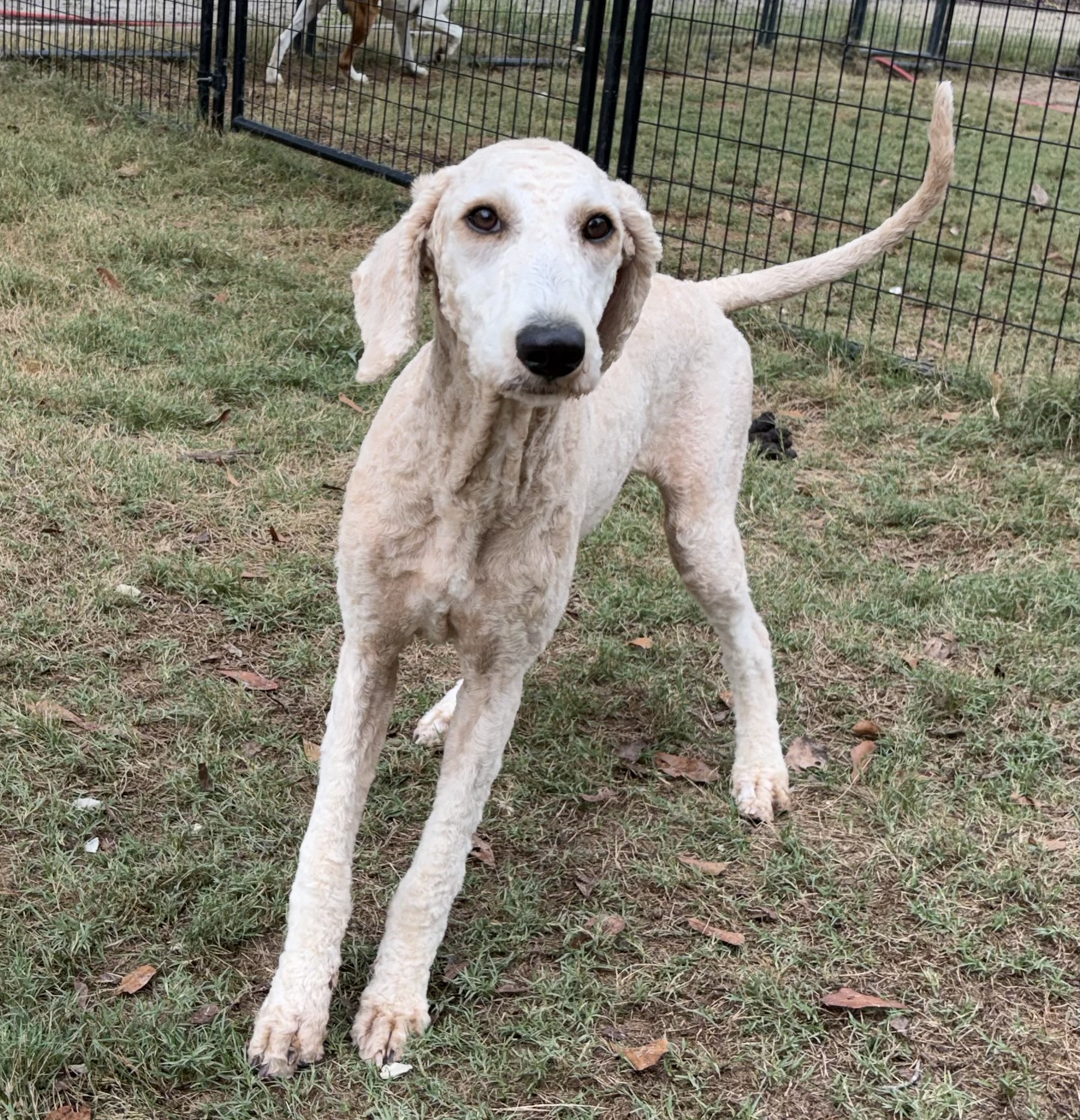 This 1.5 yr old weighs 47 lbs. She is not just a gorgeous apricot color and photos do not do her justice. She is very much a velcro dog and wants to be touching you. She is good with dogs and seems to need to be with one so we feel she would do best with a dog in the home with her. She has nt been cat tested but can be, She is a very sweet girl. She arrived in rescue with her brother and has now been fully vetted. She is potty trained. We are still learning more about her and will update her bio as we do.