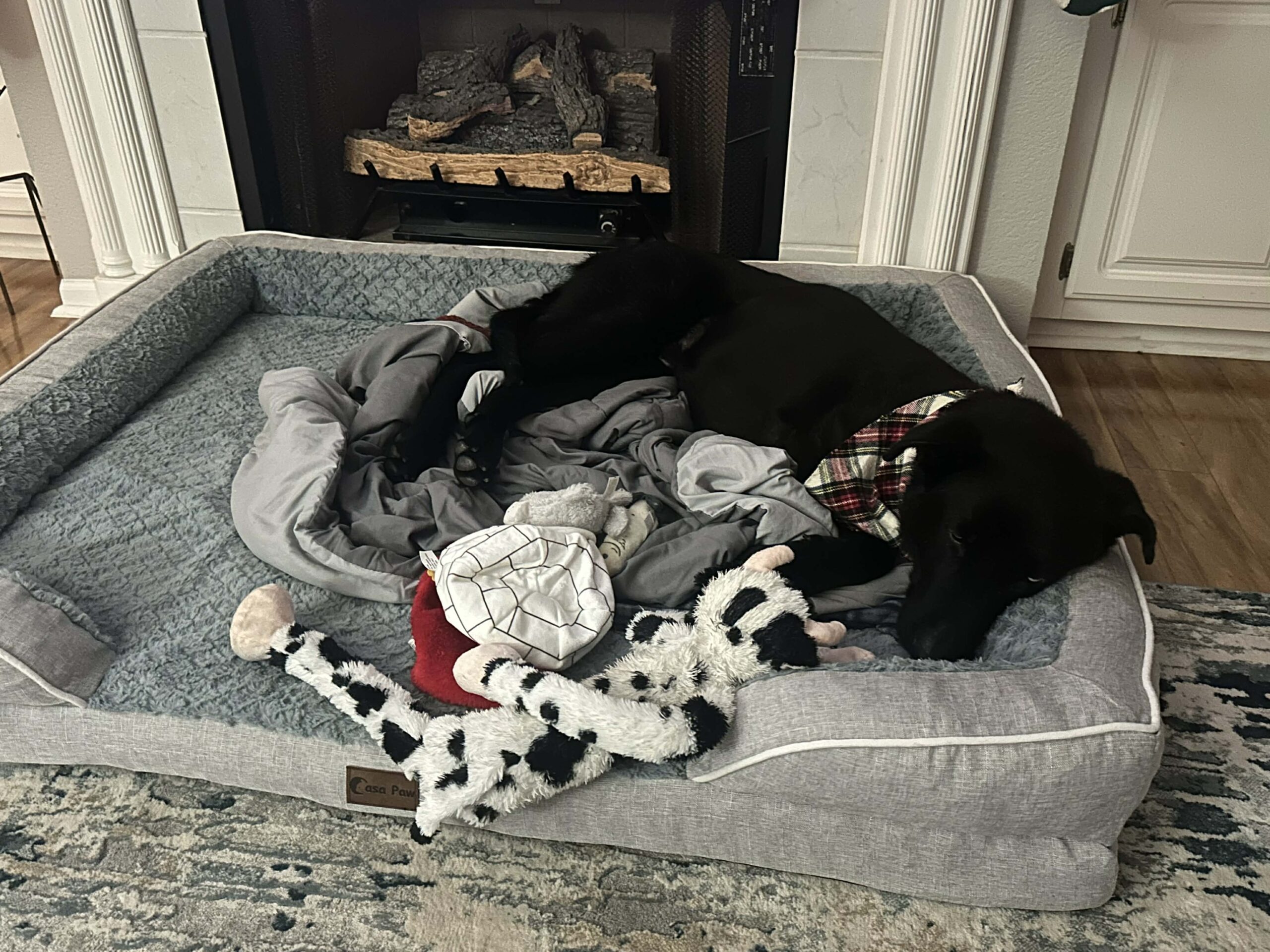 He loves loves loves a good stuffy toy to carry around proudly. Petey gets a bit growly over his newly discovered toy obsesssion, but has never done anything more than growl. He is super easily corrected, but he will need some time to adjust if his new sibling(s) love toys as much. Not a big risk, as he is currently bossed around by 10lb and 14lb dogs! He loves a soft dog bed. The bigger the better! Great car rider- he begs to go along!