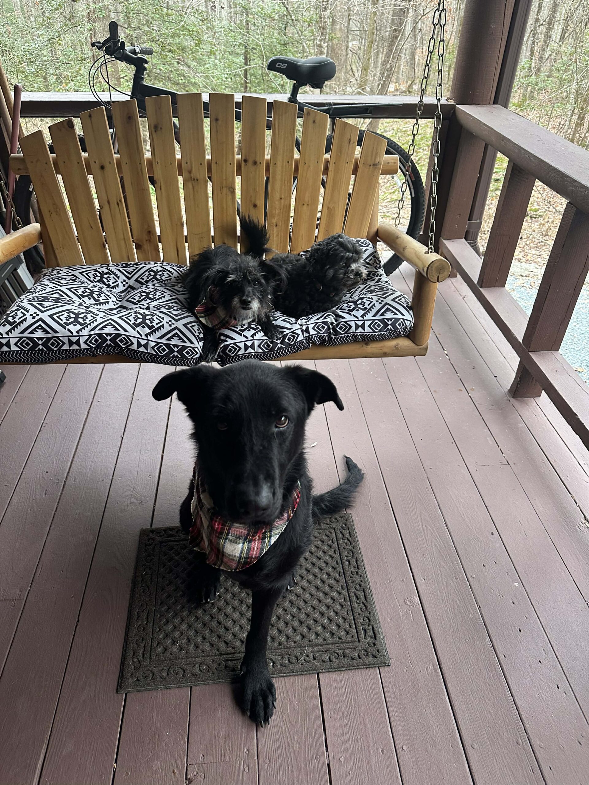 Crate trained. Vicious sounding bark to deter intruders (wouldn’t hurt a fly). He is great with all animals and ages of humans.