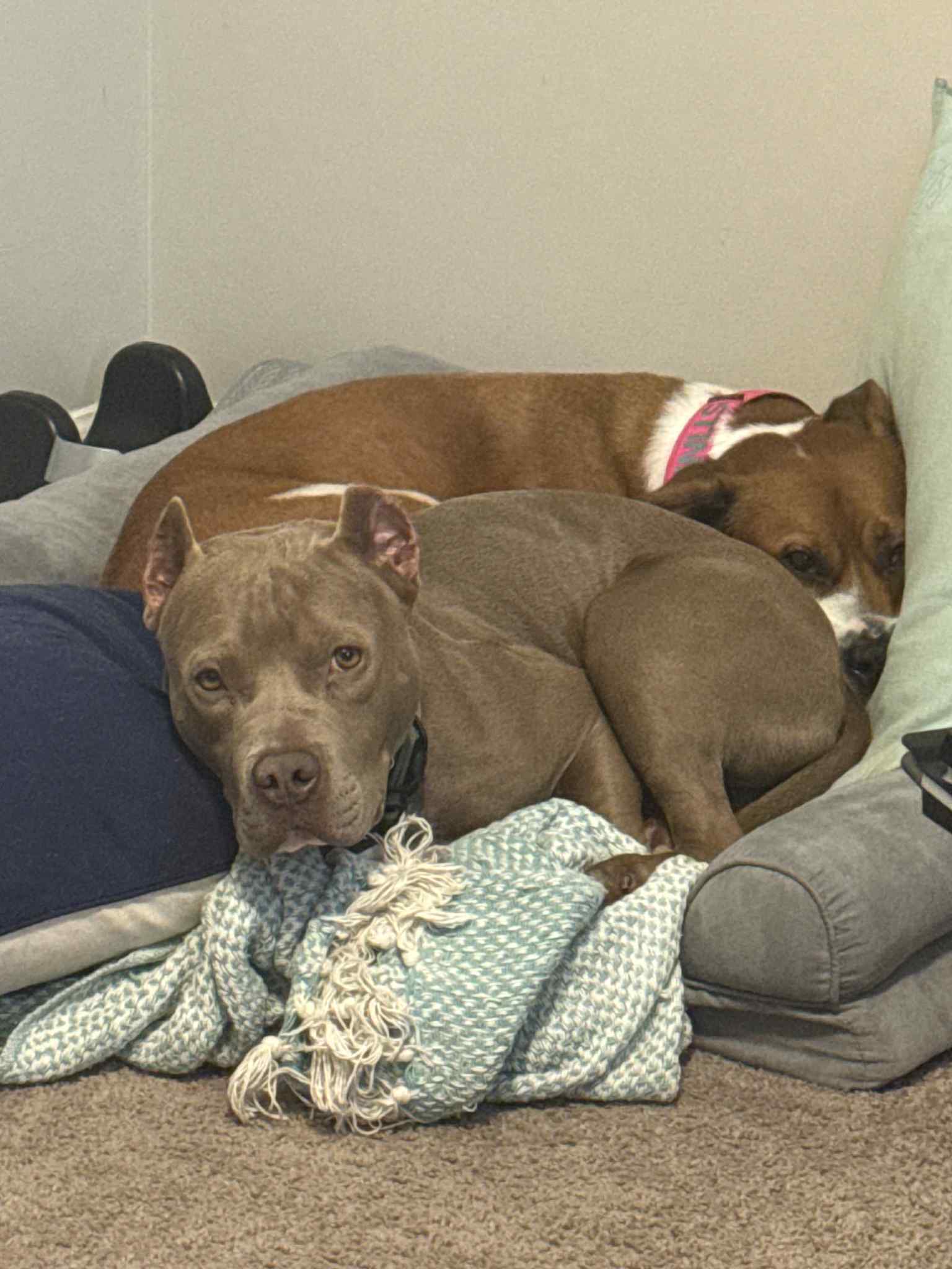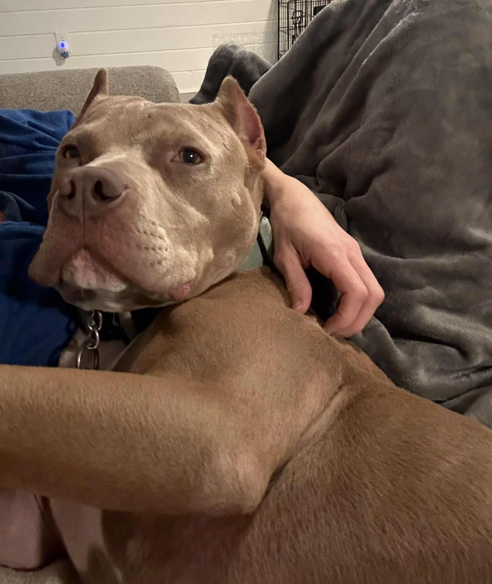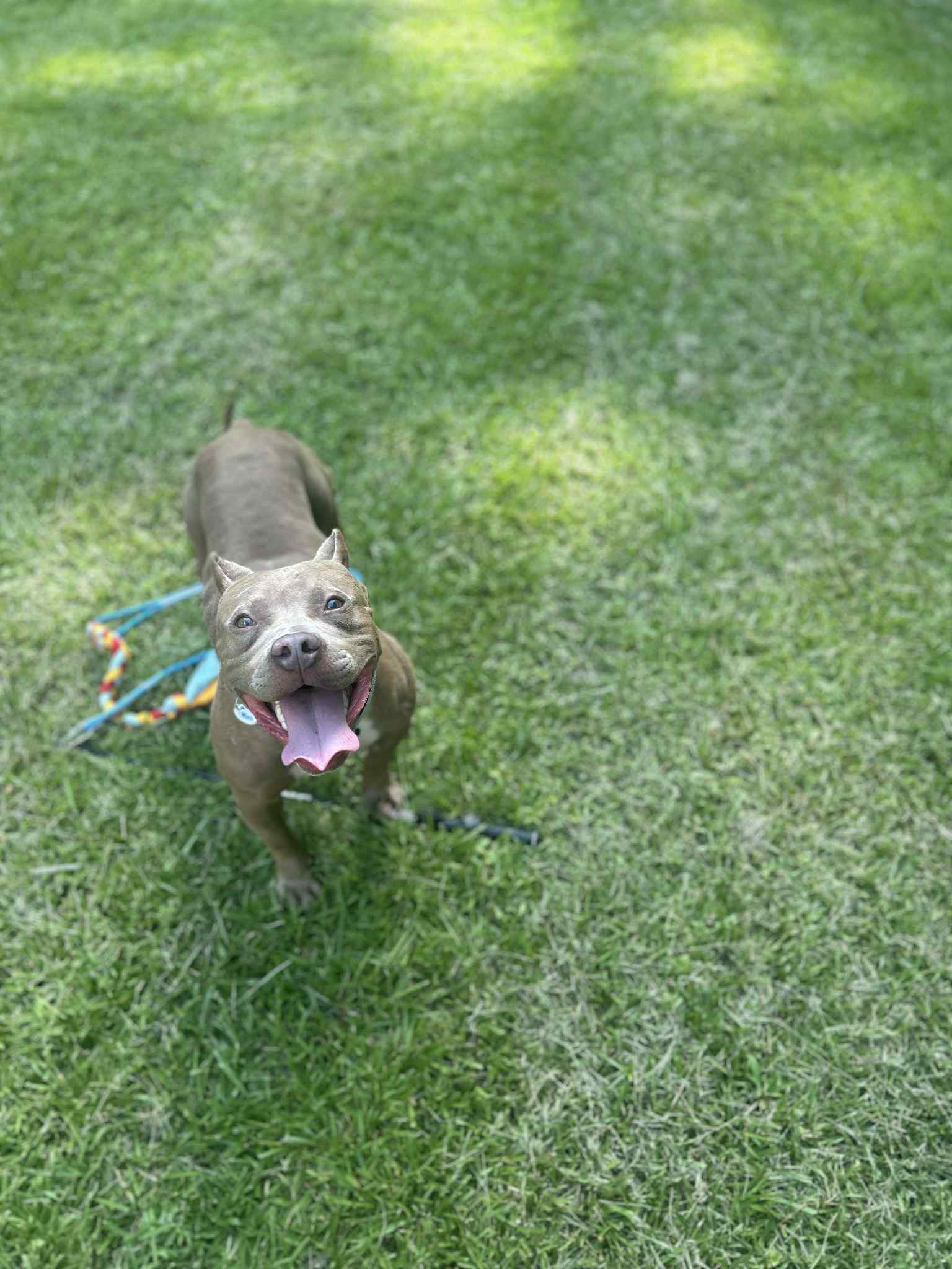 Nacho is a roughly two year old Pitbull that is a complete velcro dog. If you get up, he will follow and be at your side showing his support. He will steal your heart with his sweetness and gentle ways. He loves to snuggle, chew bones, and snuggle some more. You can catch him enjoying mid day couch naps like the potato he is. Don’t let his stocky boy muscles deter you, he’s a sensitive boy with lots of love to give. Nacho came into rescue after a tough life, and he has a few scars to show for it (both physically and mentally). His current foster siblings are two dogs (male and female) and he’s done well with them. His foster family thinks he would do best with a female dog or as the only dog. He needs a loving family that will continue to build his confidence and show him the love he deserves. Will you give this sweet pittie a chance at a loving fur ever home?