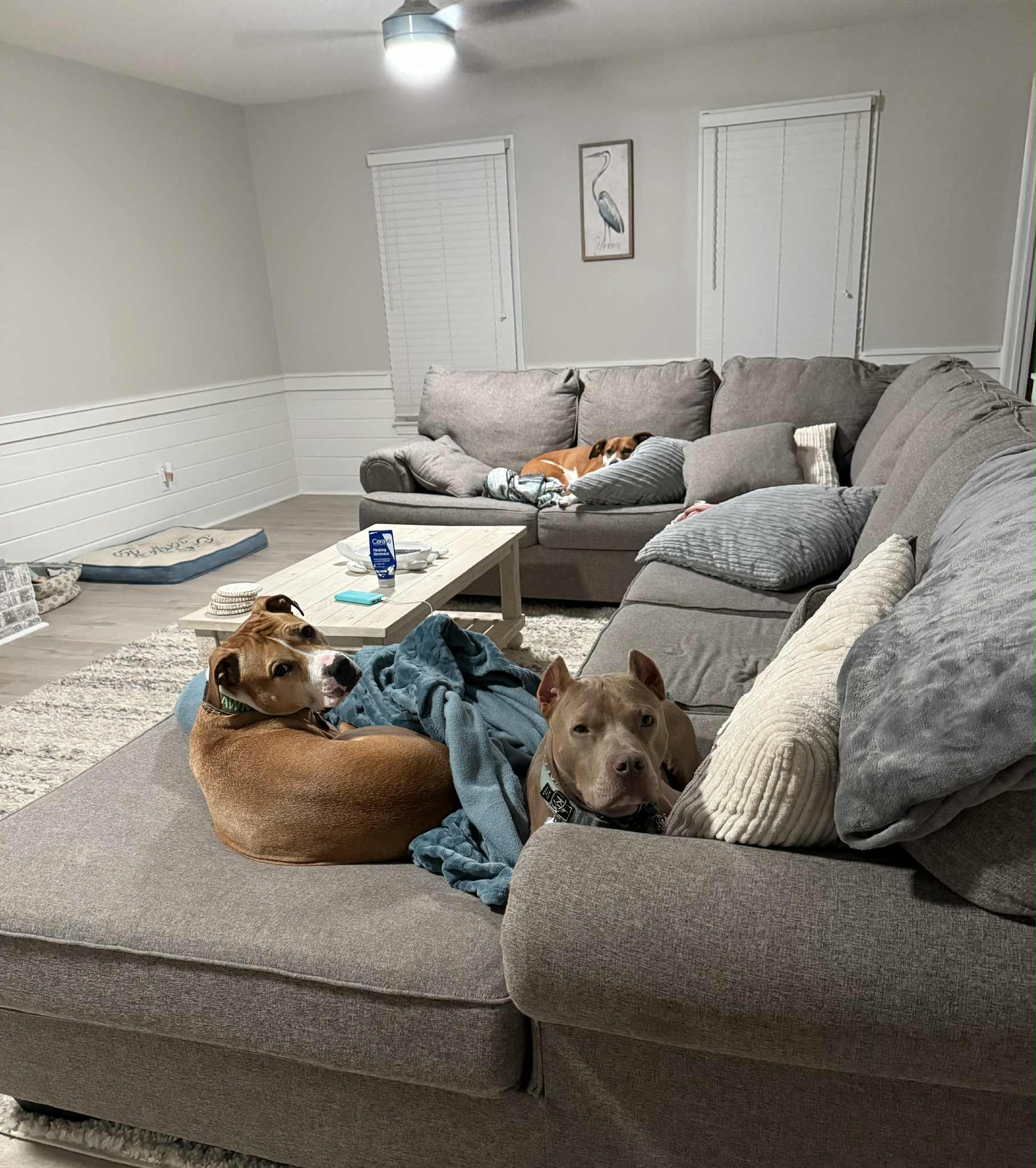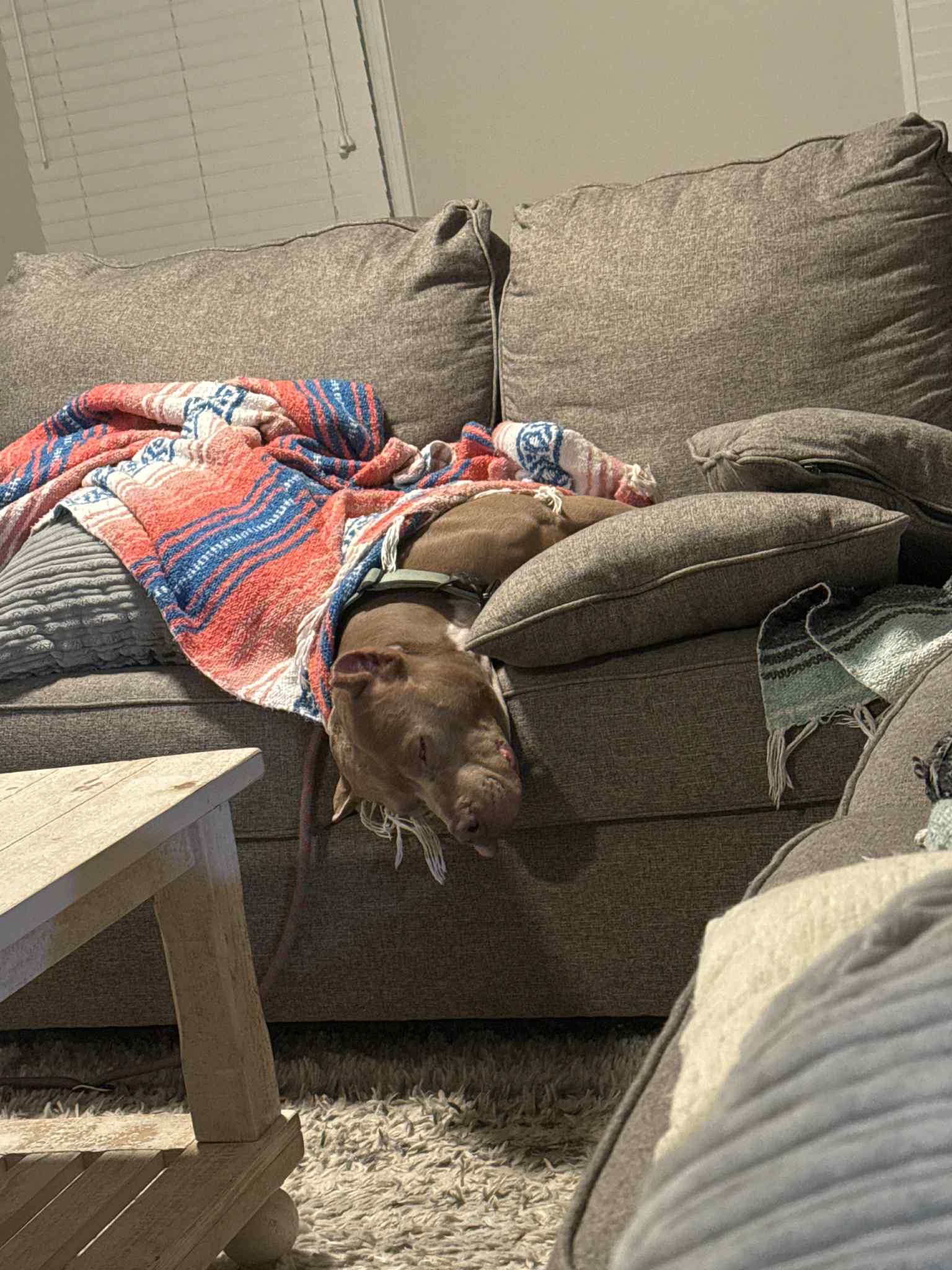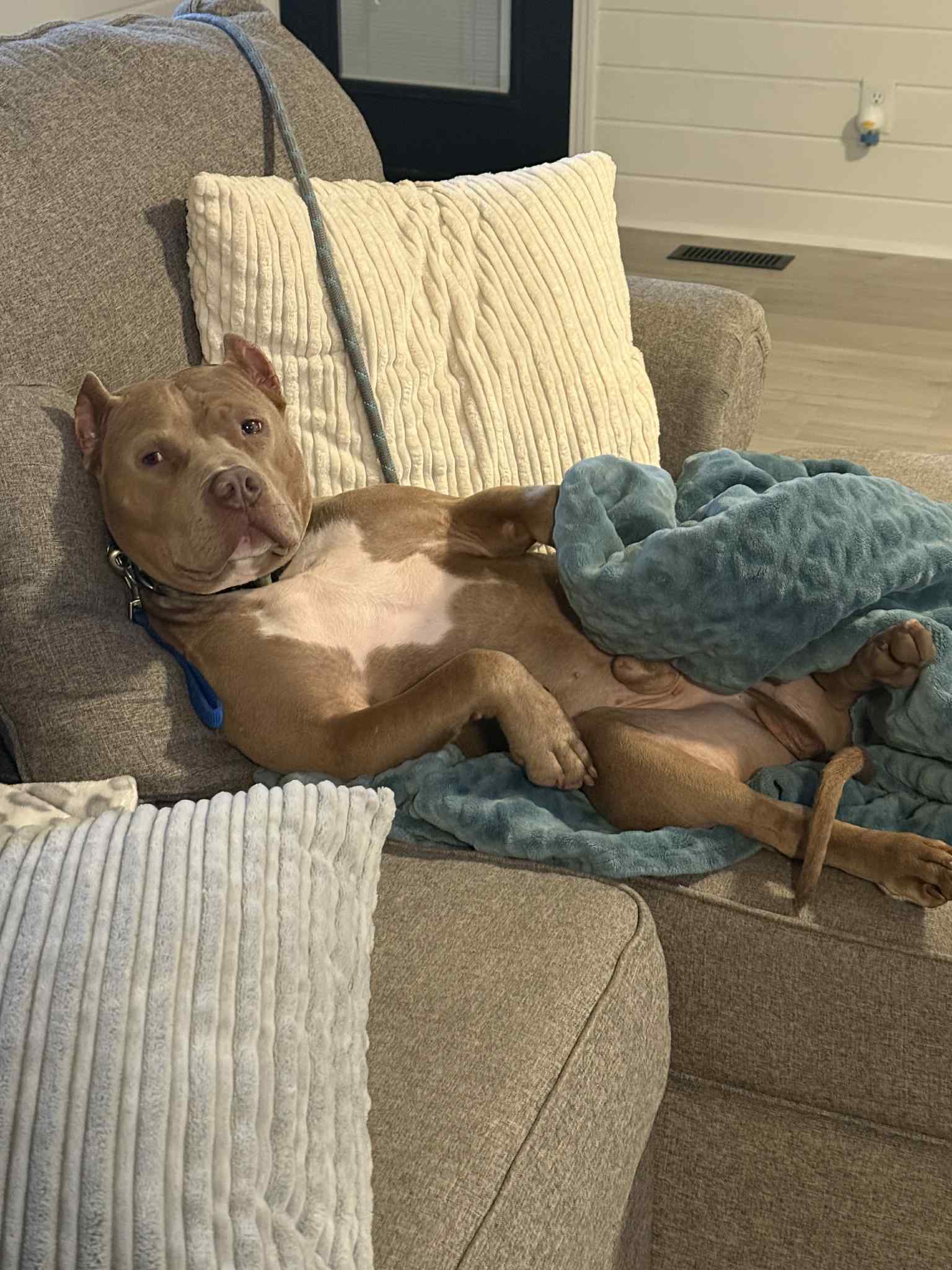 Nacho is a roughly two year old Pitbull that is a complete velcro dog. If you get up, he will follow and be at your side showing his support. He will steal your heart with his sweetness and gentle ways. He loves to snuggle, chew bones, and snuggle some more. You can catch him enjoying mid day couch naps like the potato he is. Don’t let his stocky boy muscles deter you, he’s a sensitive boy with lots of love to give. Nacho came into rescue after a tough life, and he has a few scars to show for it (both physically and mentally). His current foster siblings are two dogs (male and female) and he’s done well with them. His foster family thinks he would do best with a female dog or as the only dog. He needs a loving family that will continue to build his confidence and show him the love he deserves. Will you give this sweet pittie a chance at a loving fur ever home?