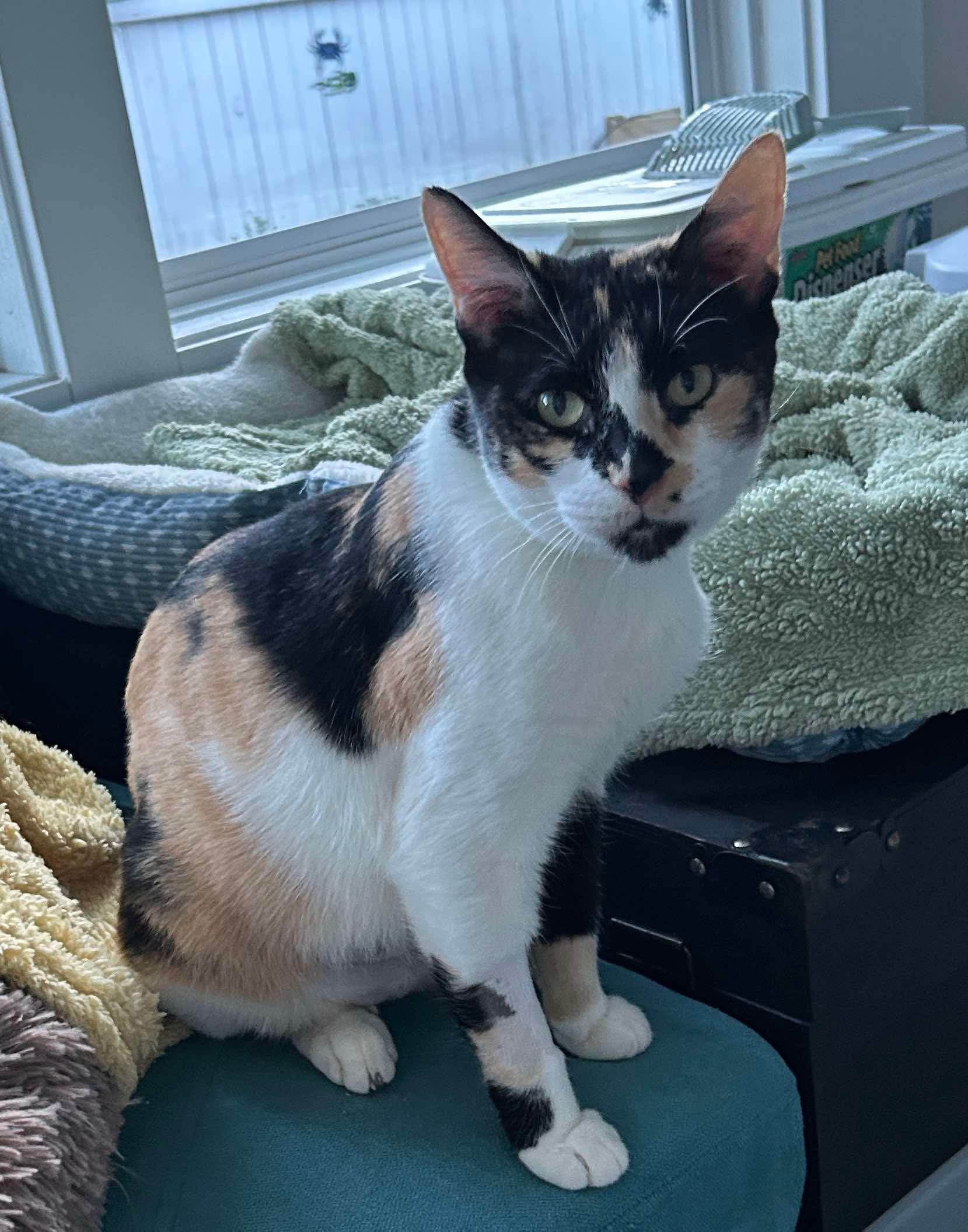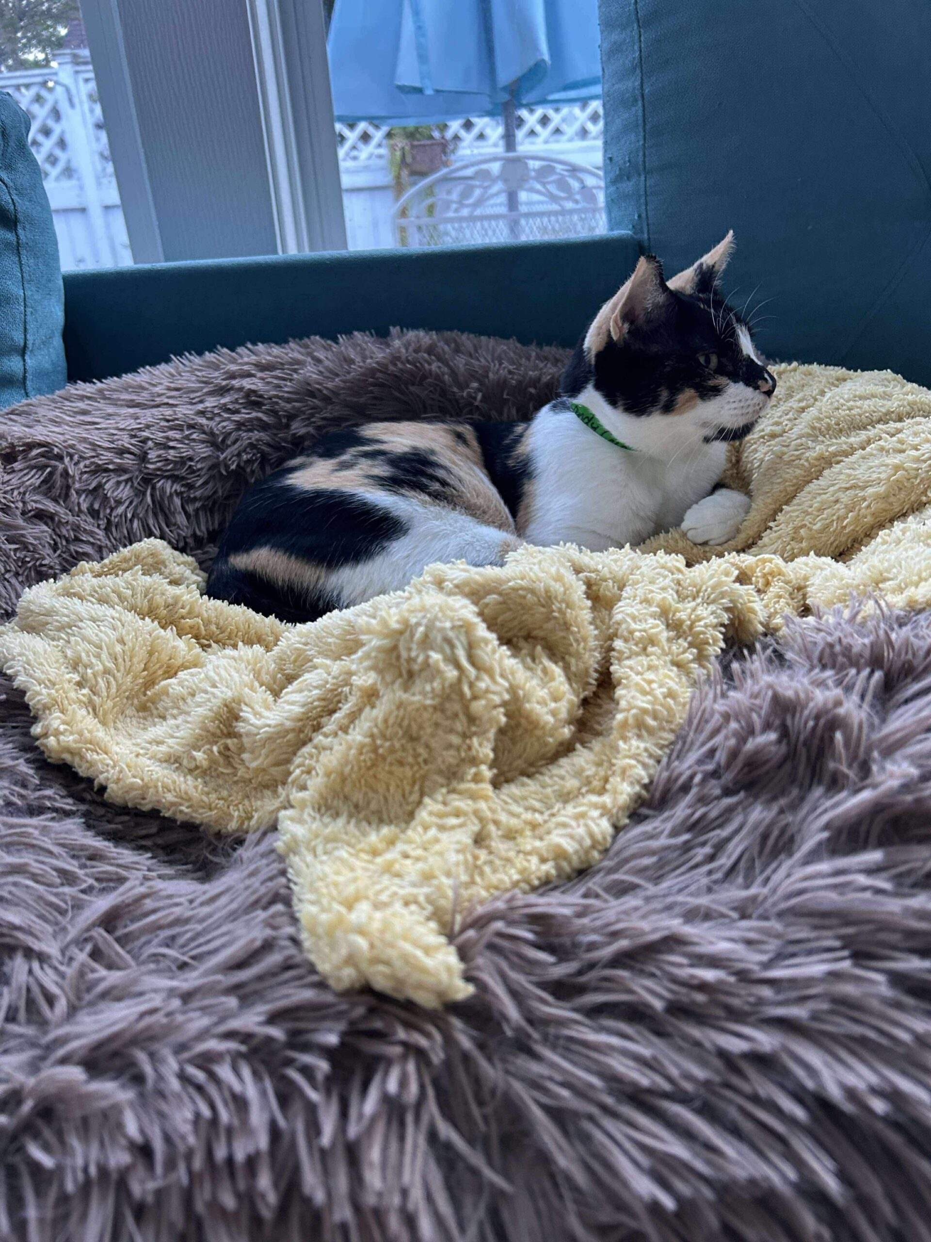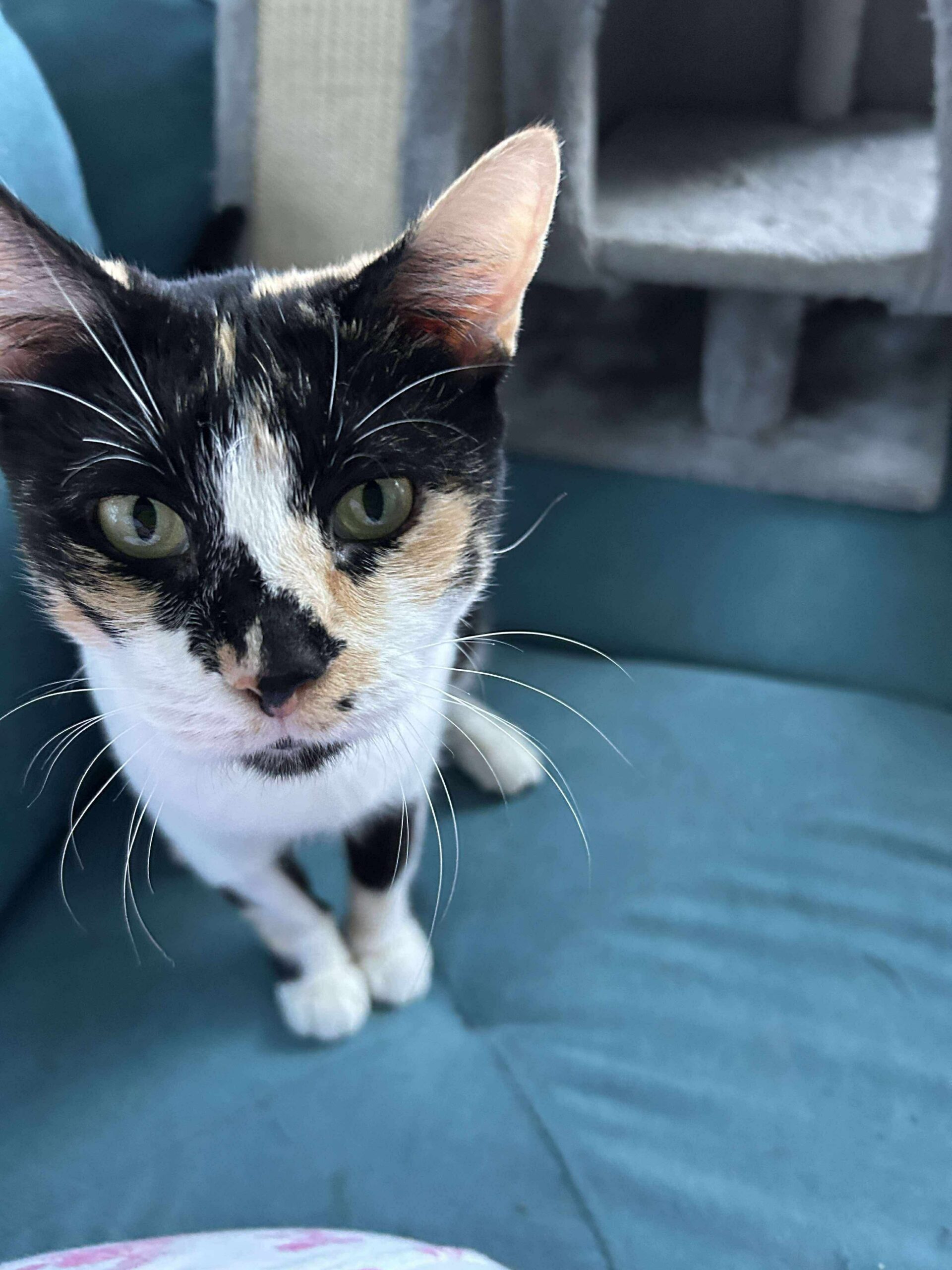 She is a sweet and quiet girl, very easy cat who is calm and gentle. She is litter box trained and has not scratched things she should not. True to the calico nature, she takes a little to warm up, but once she does she enjoys ear scratches and attention.