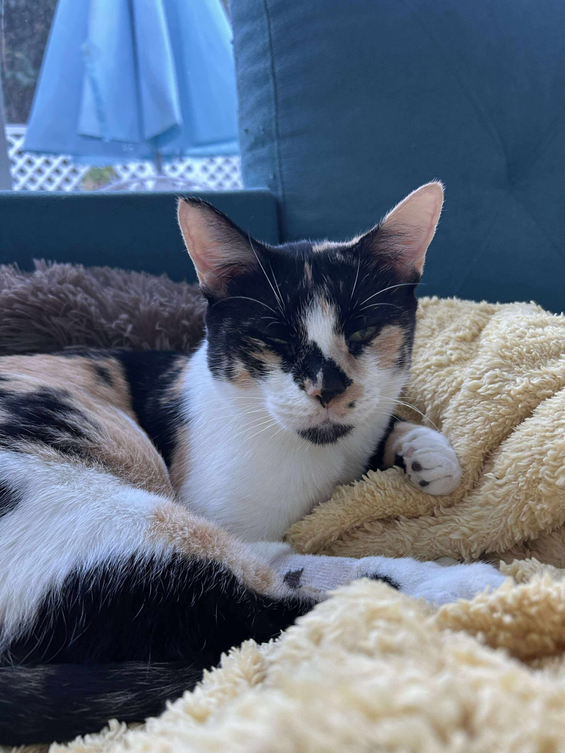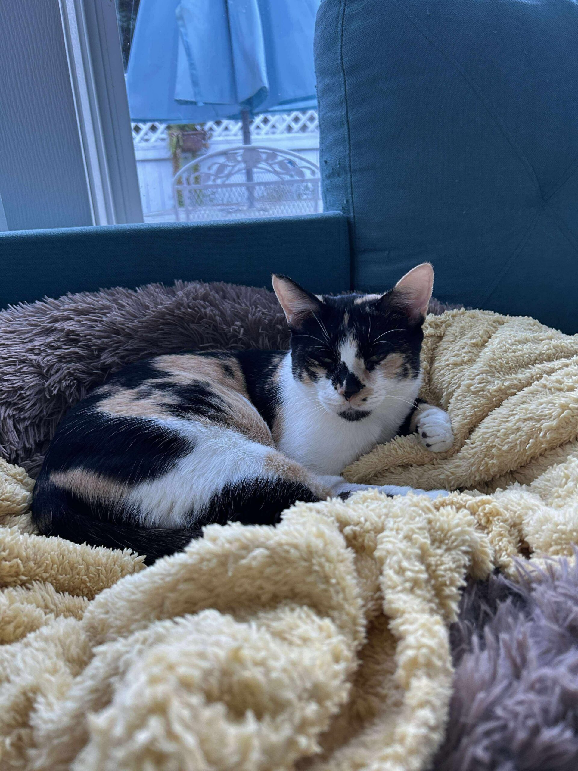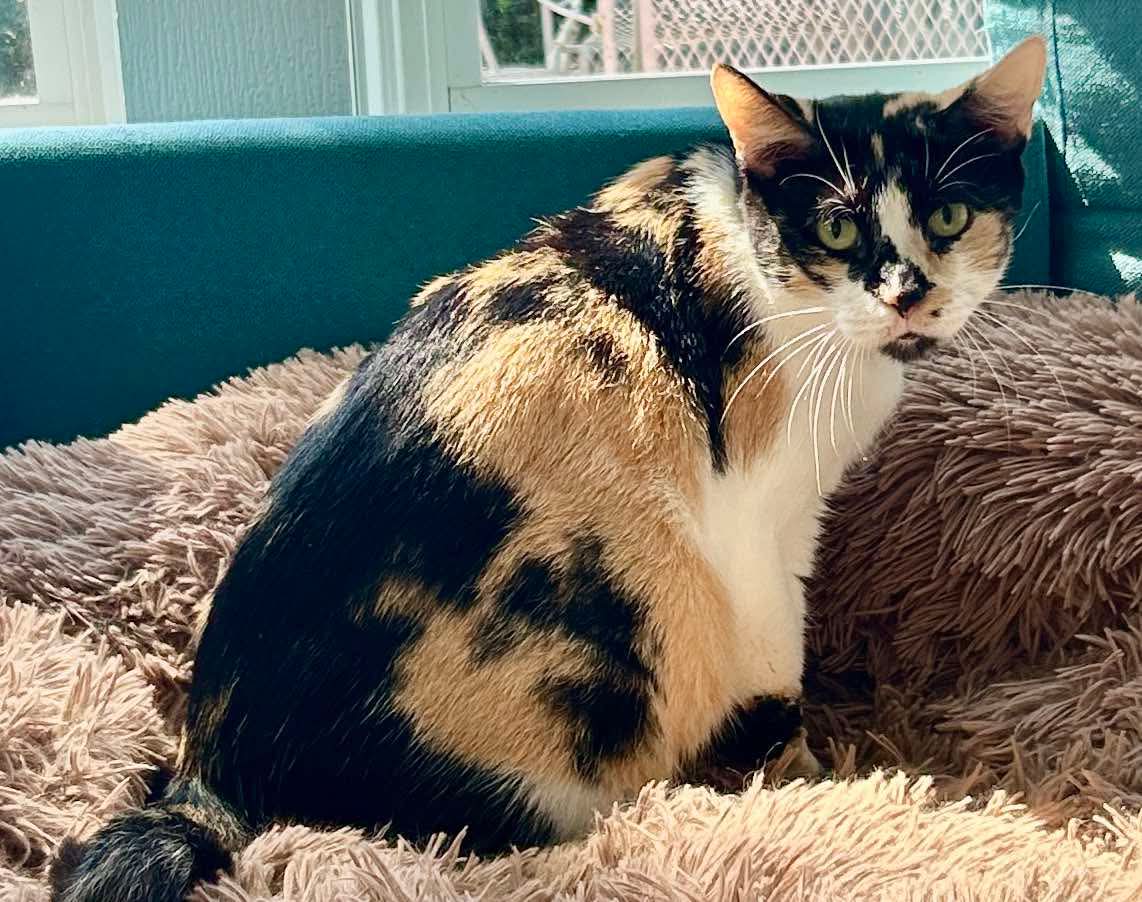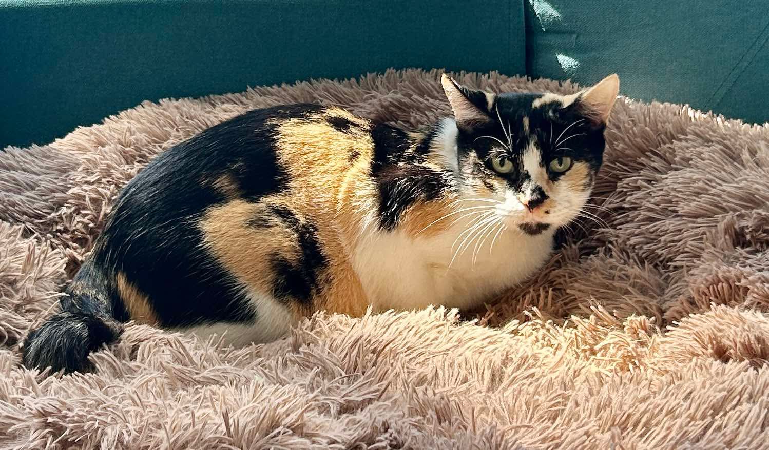 She is a sweet and quiet girl, very easy cat who is calm and gentle. She is litter box trained and has not scratched things she should not. True to the calico nature, she takes a little to warm up, but once she does she enjoys ear scratches and attention.