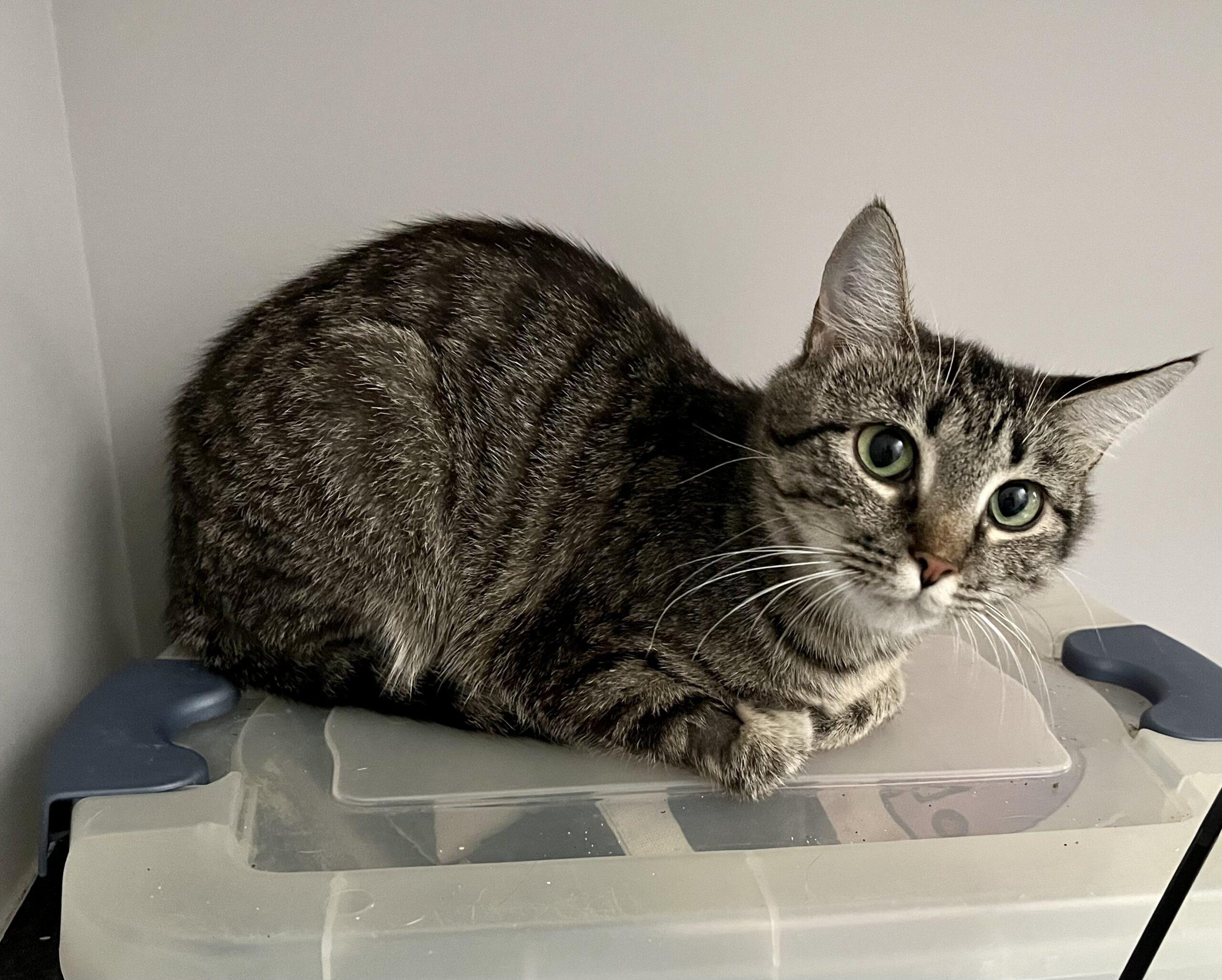 Cleopatra is 5 pounds in just under a year. She is a sweet calm social girl. She is the perfect lap kitty. She is wonderful with other cats. She is good with dogs as long as they leave her alone for the most part. If they corner her, she will arch and hiss.