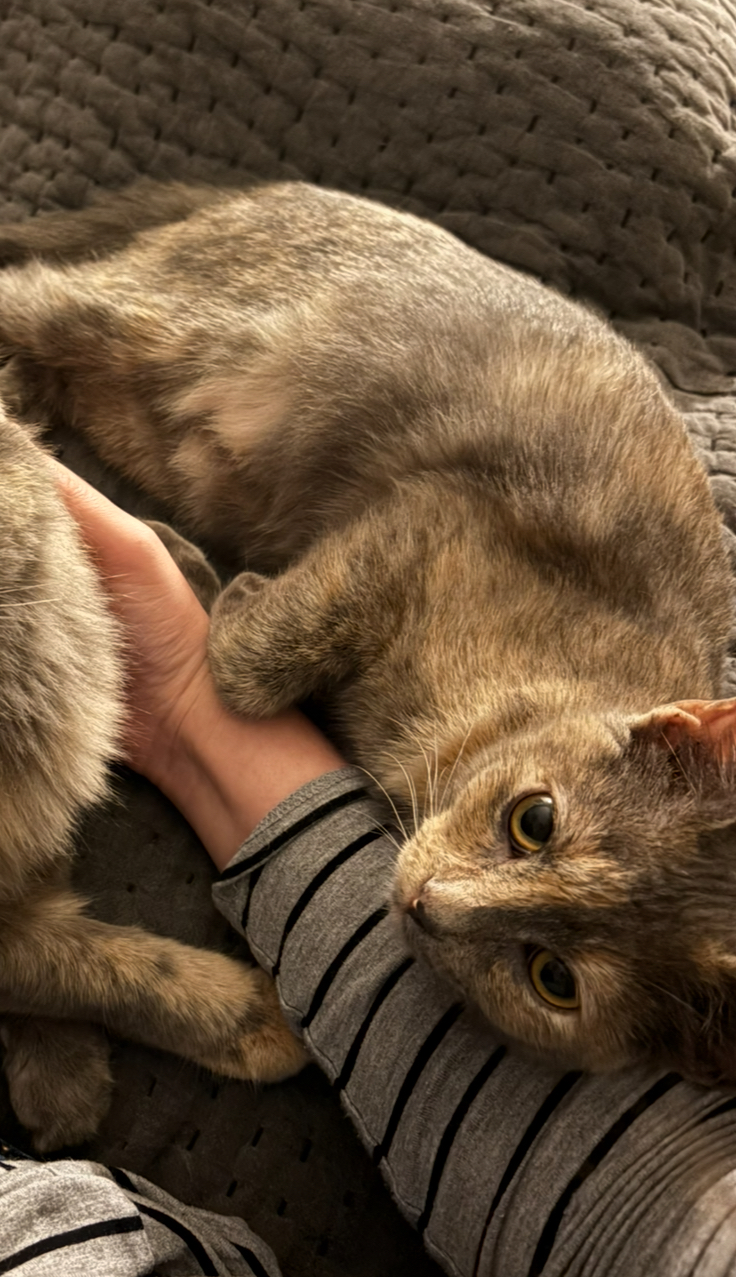 After a long day of dramatic pouncing and toy conquests, she transforms into a warm, purring marshmallow. She loves curling under the covers, tucking her face into your hand, and falling asleep with her tiny motor running.
